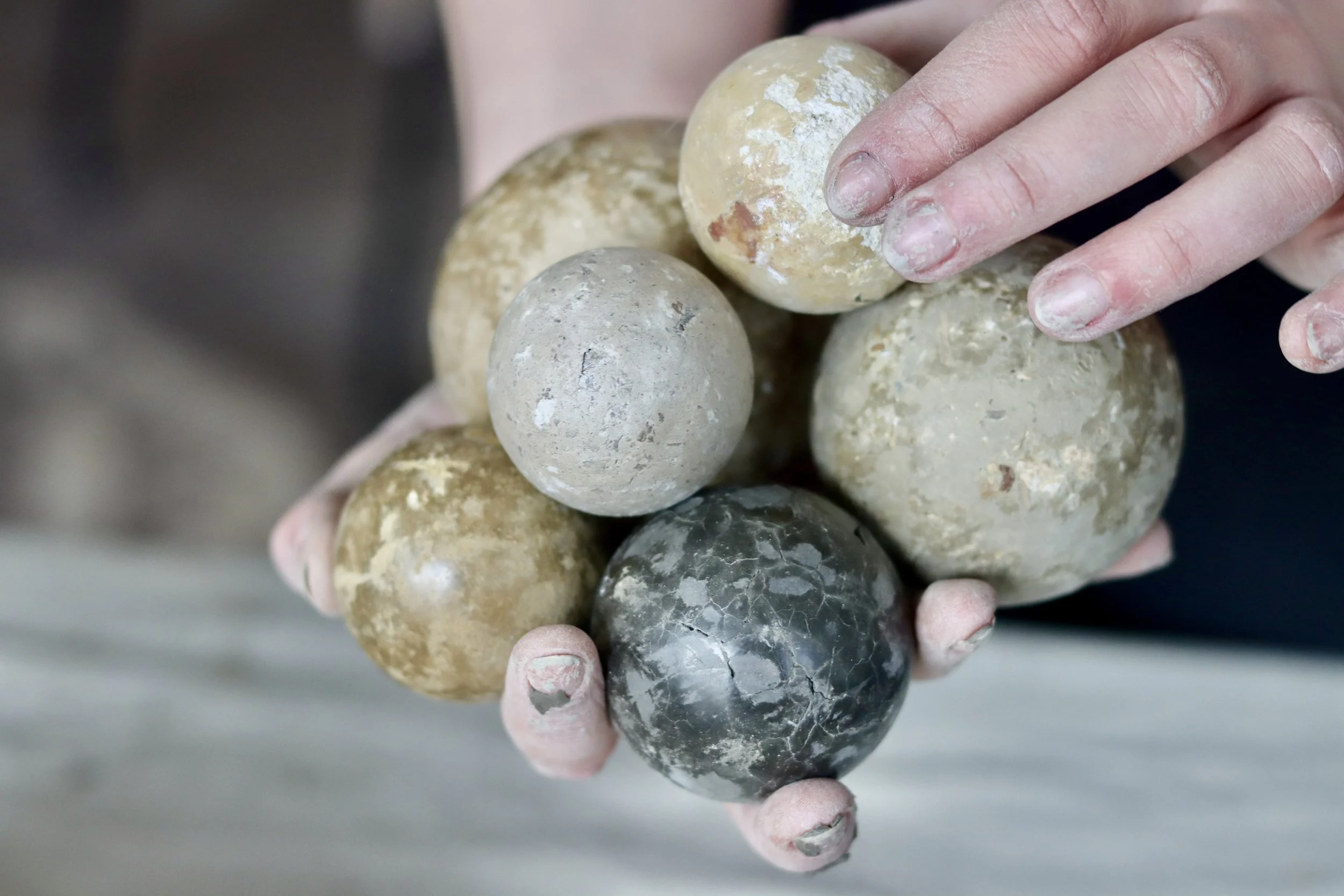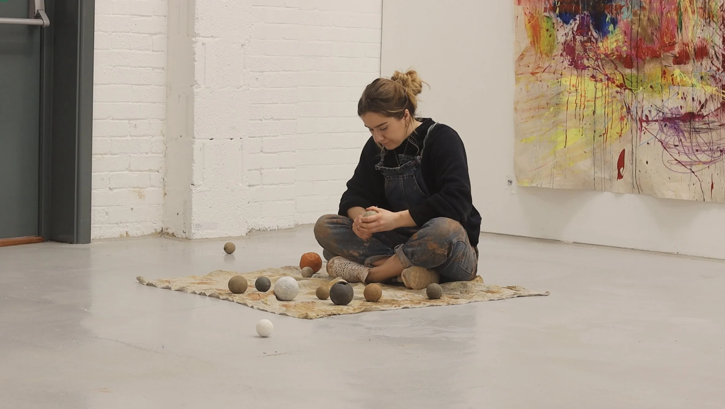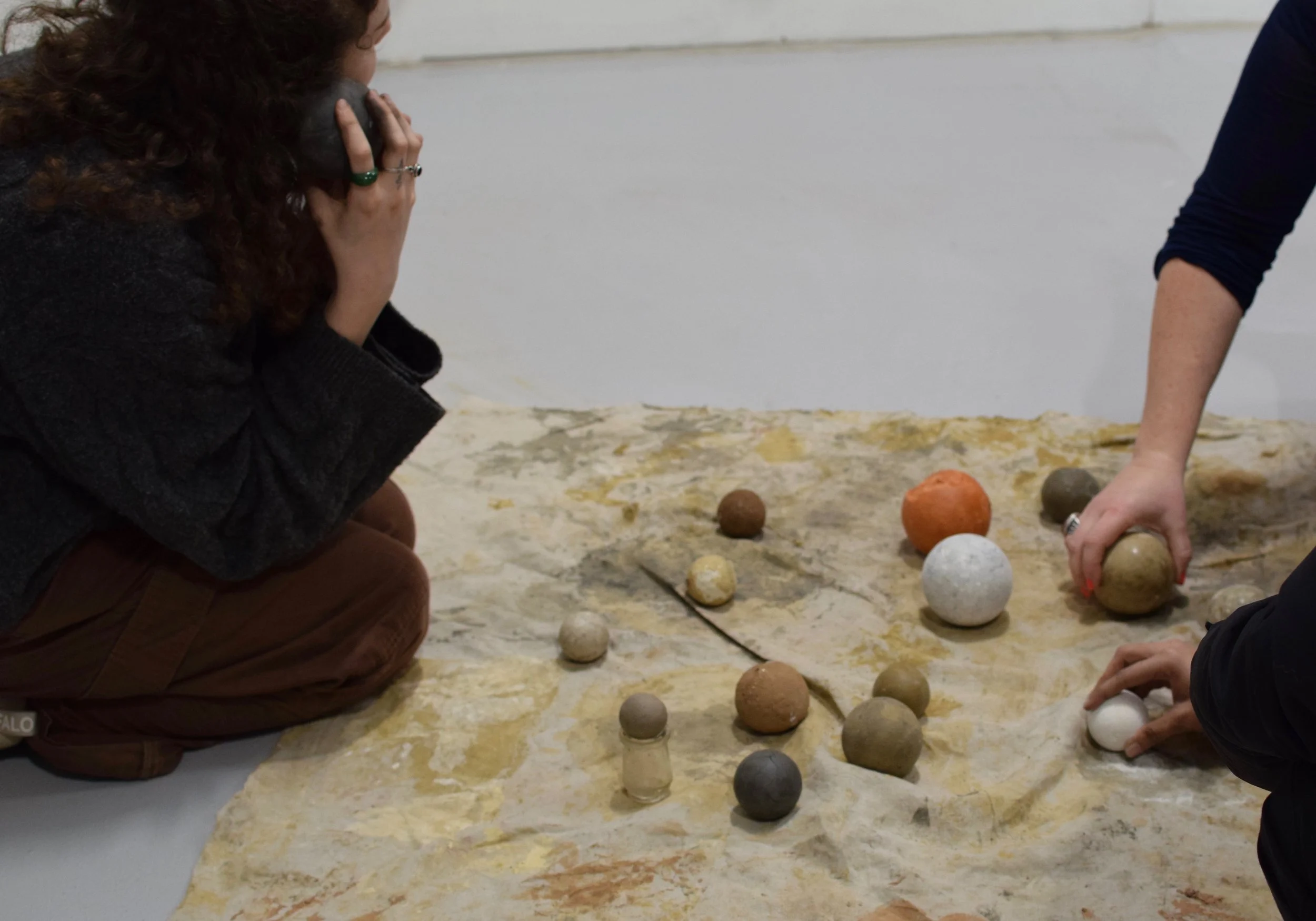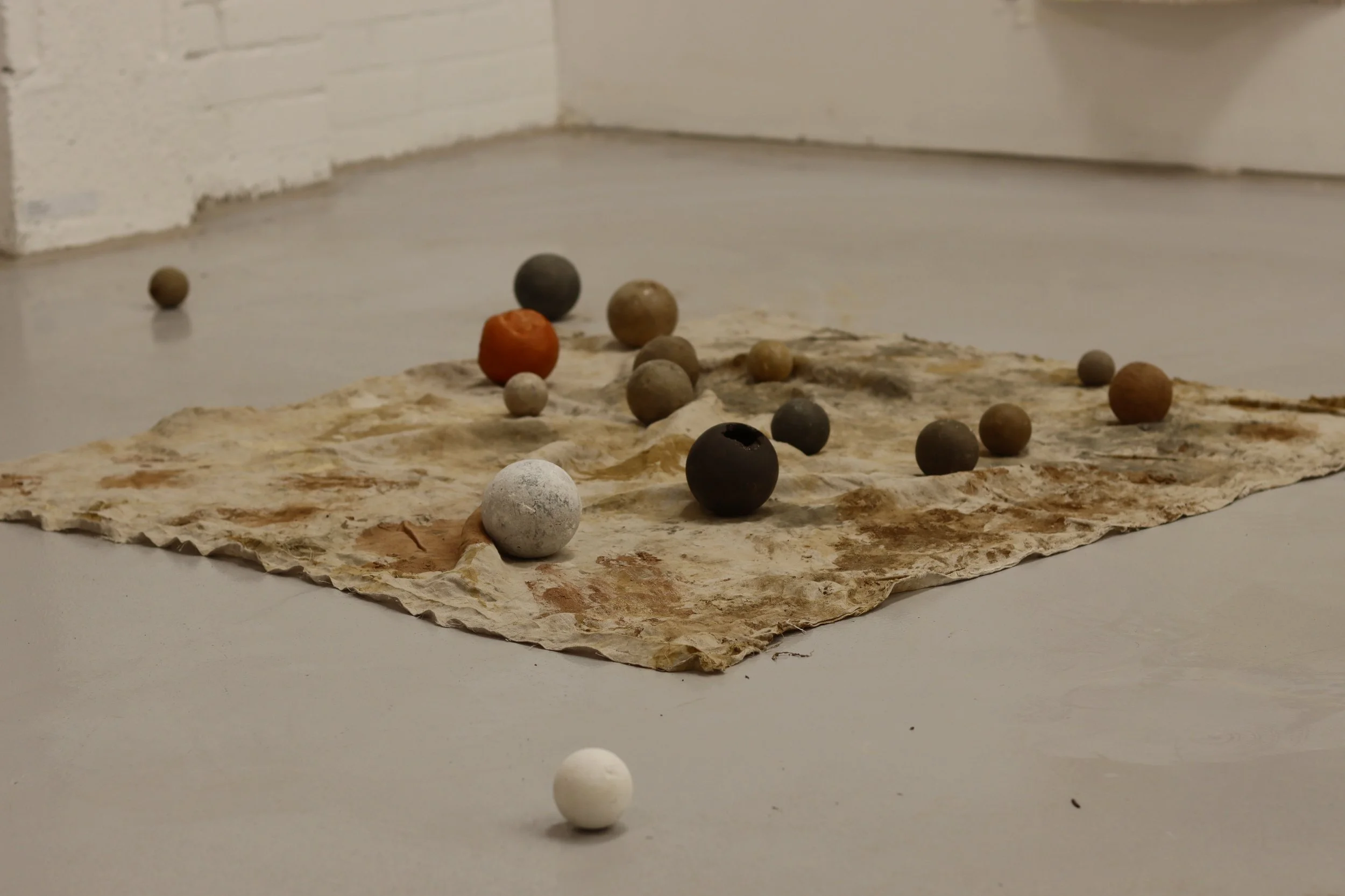 The work began with a performance: seated on the floor, I shaped the first dorodango balls slowly by hand using gathered clay, earth pigments, and water. This meditative act of forming was not separate from the installation but part of its unfolding. As the performance ended, I left the objects in place, resting on a piece of naturally dyed cloth, and invited the audience to engage freely. No signage or instruction guided them, only the visual and material presence of the spheres.