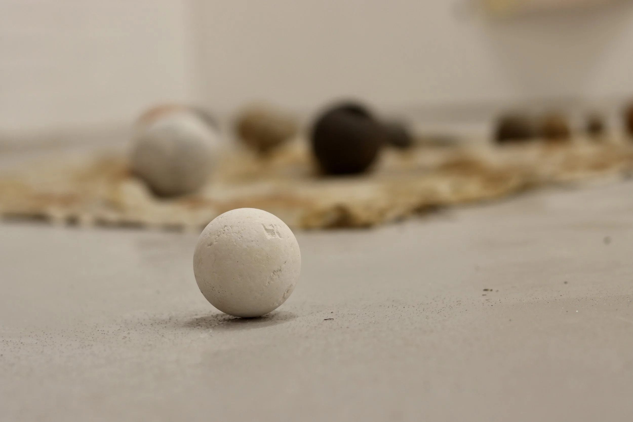 Throughout the exhibition, I observed the audience's responses. Some hesitated, unsure if they were allowed to touch. Others knelt, rolled, grouped, or gently rearranged the balls. A few began to draw lines across the mat using the spheres, tracing spontaneous paths through dust and pigment. These interactions became their own choreography - unscripted, fleeting, and collaborative. The gallery floor became a site of play, negotiation, and quiet exchange.