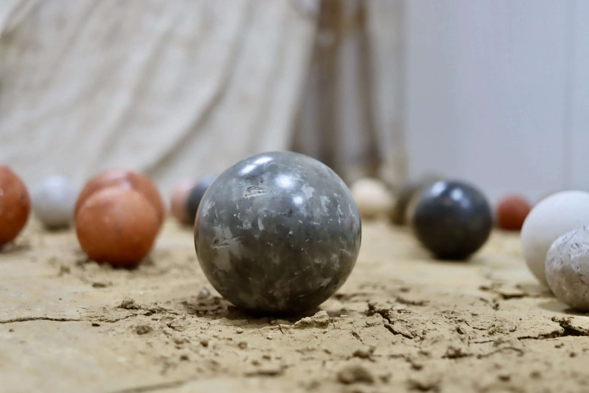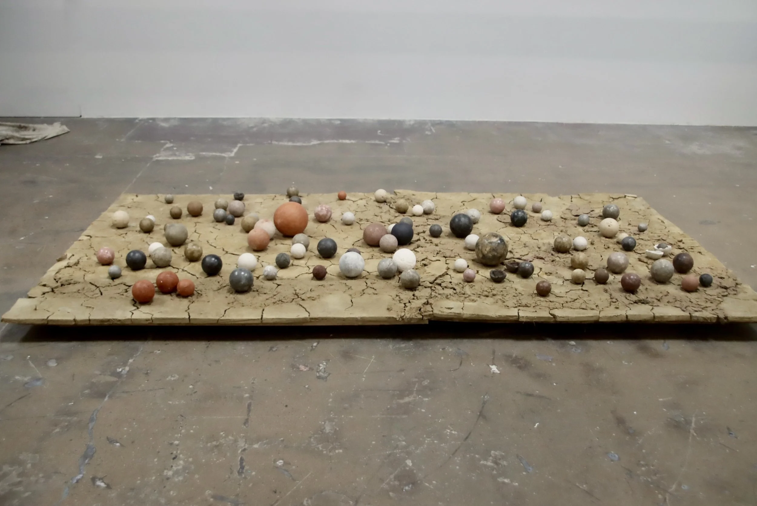 The clay spheres, Dorodongo Balls, were created through the projects Salt and Clay and Testing Ground. In Salt and Clay, I worked directly on the Dorset coast, forming spheres from hand-dug clay and returning them to the sea in acts of slow reciprocity. The project became a dialogue between clay and water, between permanence and erosion, between human gesture and natural cycles. In Testing Ground, I shifted the focus toward interaction and play - bringing the dorodango balls into the gallery, where they were shaped by performance and then left for the audience to encounter on their own terms. That work explored the politics of touch, of invitation, and the shifting roles of artist and viewer.