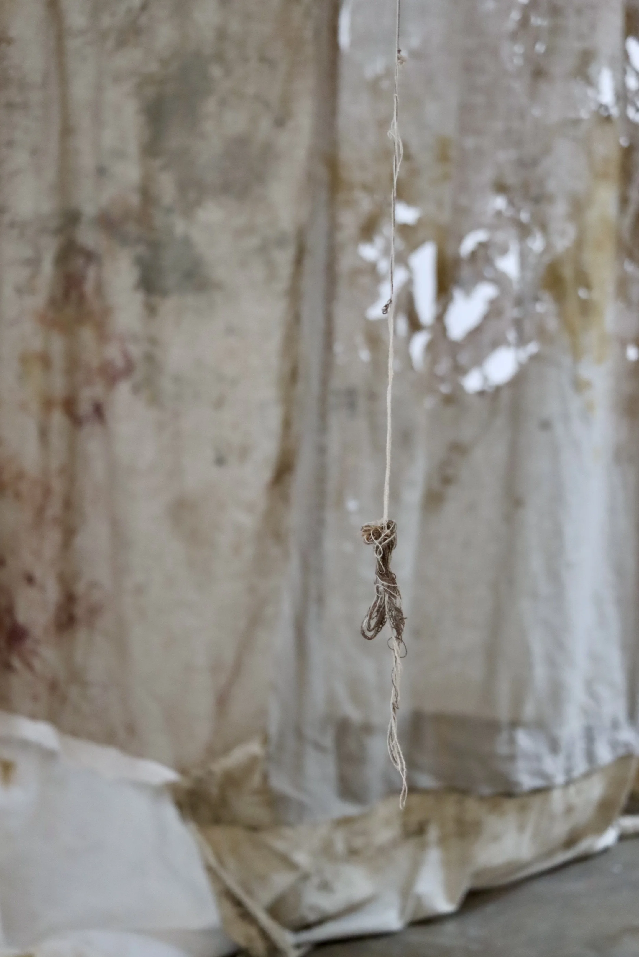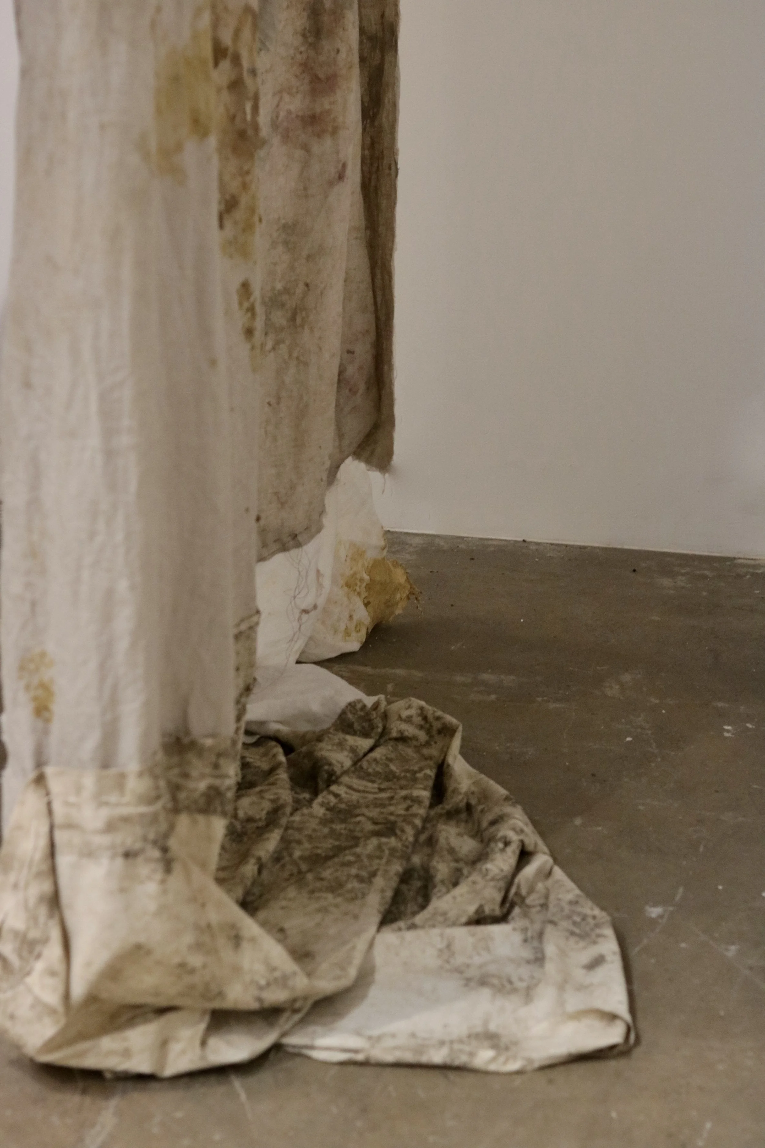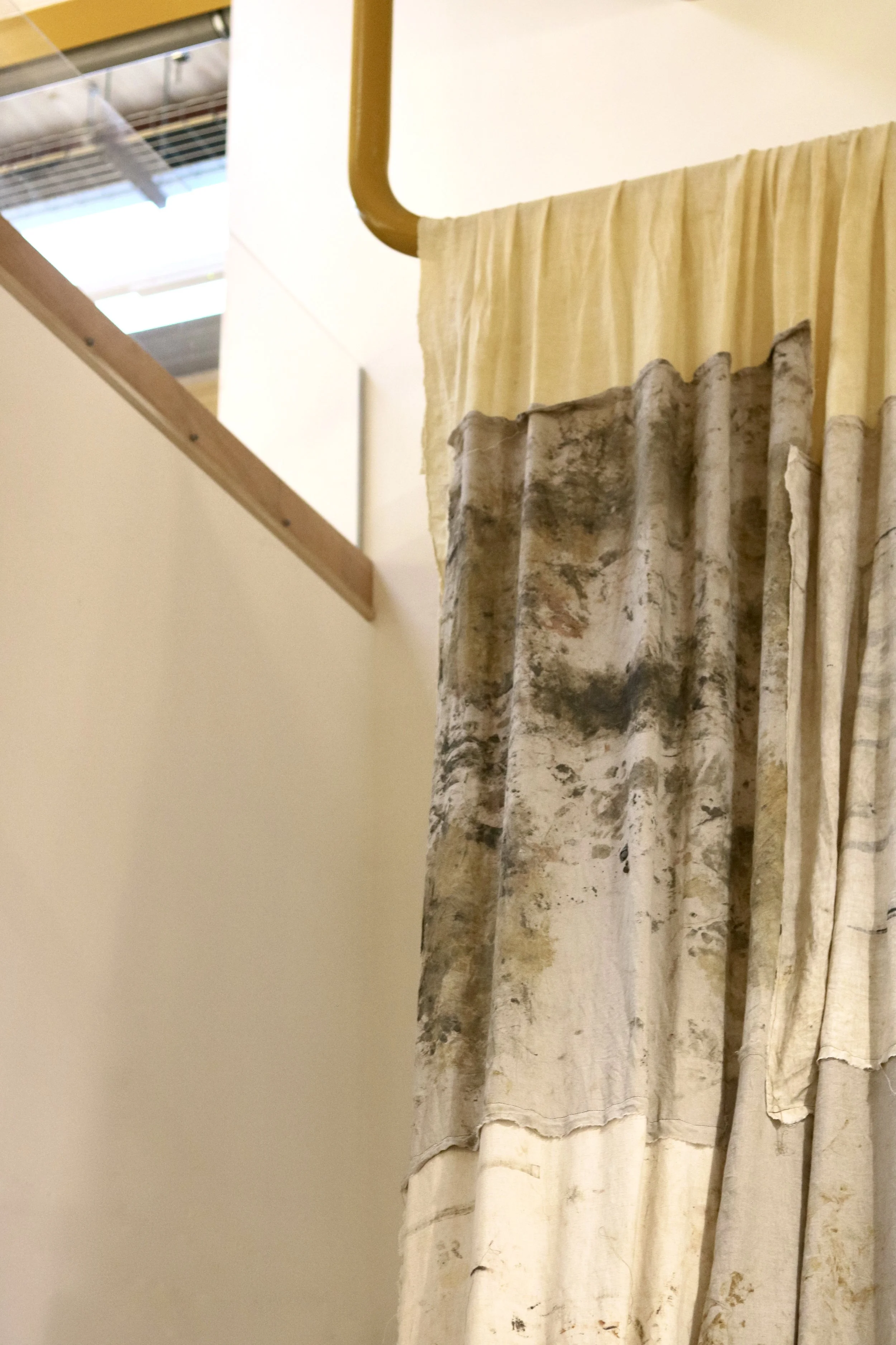 Above the platform, a large hanging textile piece acts as a canopy - dyed, stained, and screen-printed using natural pigments and clay from the same sites. It records and responds to the movement of the land, absorbing the residue of place and process. The fabric is not simply background or documentation - it is part of the work’s material language. It hangs like a suspended landscape, folding and unfolding, shifting with air currents and the movement of bodies in the space.