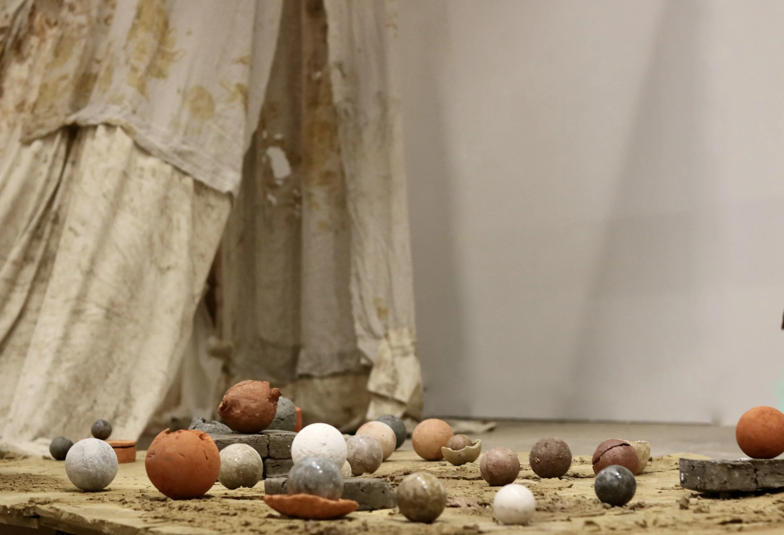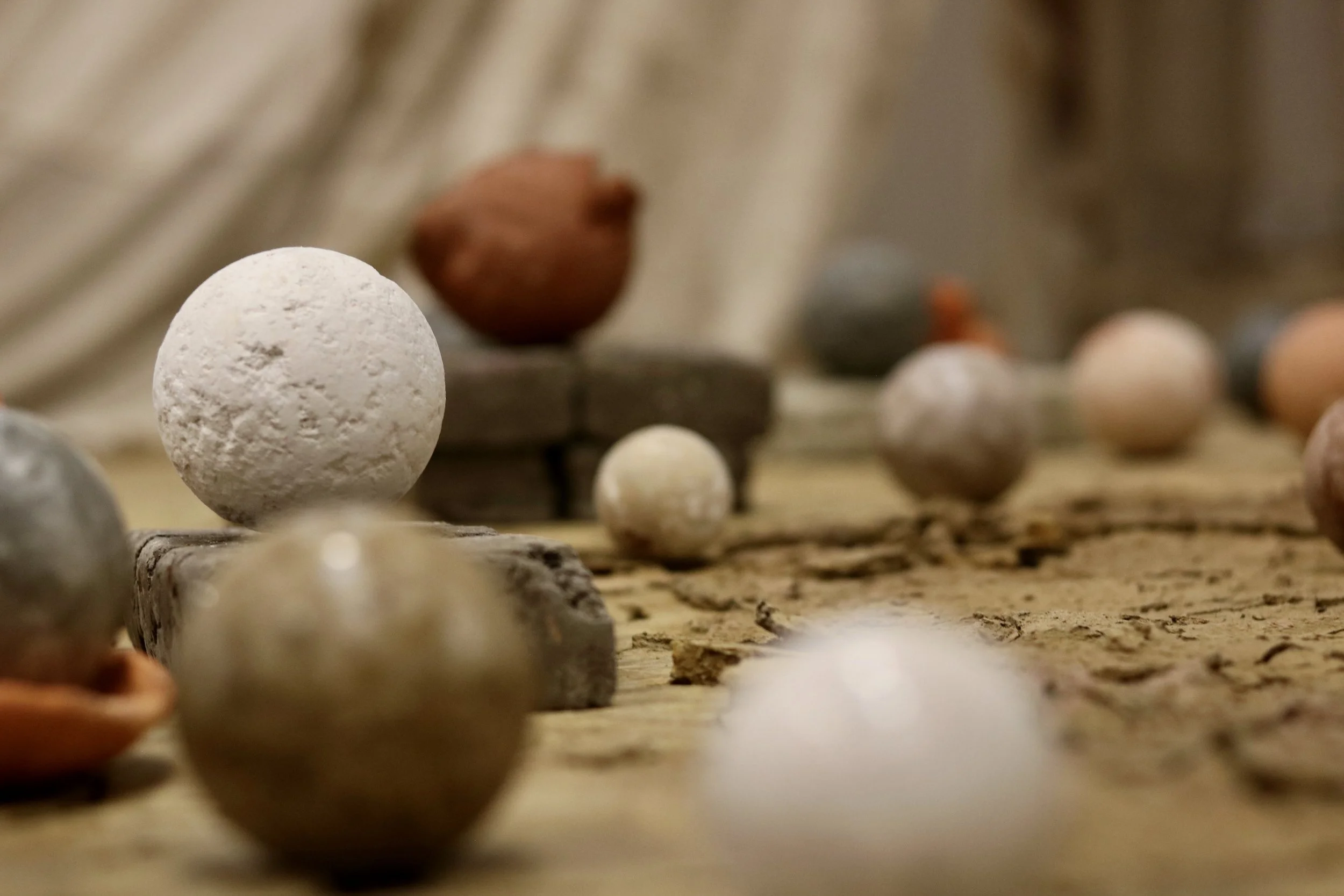 The exhibition centres around two core elements: a low, ground-level platform holding a constellation of clay spheres, and a suspended textile piece that moves gently in space above it. Both are interactive and immersive, offering different forms of engagement. Visitors are encouraged to walk around, beneath, and through the installation, forming a sensory relationship with material - to touch, rearrange, observe, and reflect.